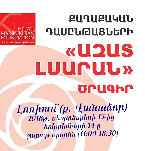 «Հրայր Մարուխյան» հիմնադրամի «Ազատ լսարան» քաղաքական դասընթացը՝ Վանաձորում Քաղաքական 21:02 – 17.09.2018 Սեպտեմբերի 15-ից Վանաձորում մեկնարկել է «Հրայր Մարուխյան» հիմնադրամի «Ազատ լսարան» քաղաքական դասընթացը: Այն կտեւի մինչեւ հոկտեմբերի 14-ը: Այս ընթացքում լոռեցի ակտիվ եիտասարդները կտեղեկանան Հայաստանին եւ հայությանն առնչվող խնդիրներին, կքննարկեն դրանց լուծման տարբերակները, կներկայացնեն իրենց մոտեցումները: Նրանց համար դասախոսություններ կկարդան ոլորտի լավագույն մասնագետները: